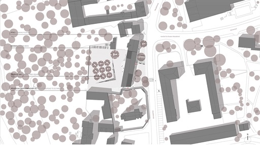 Dům by neměl být bariérou mezi návsí a zahradami. Chceme umožnit tyto světy propojit a vytvořit tak kontinuální veřejný prostor propisující se i do interiéru. Naším cílem není uzavřená instituce, ale otevřený kulturně-společenský stánek využívaný napříč generacemi, který animuje prostor kolem sebe a předurčuje ho k budoucímu kvalitnímu rozvoji.